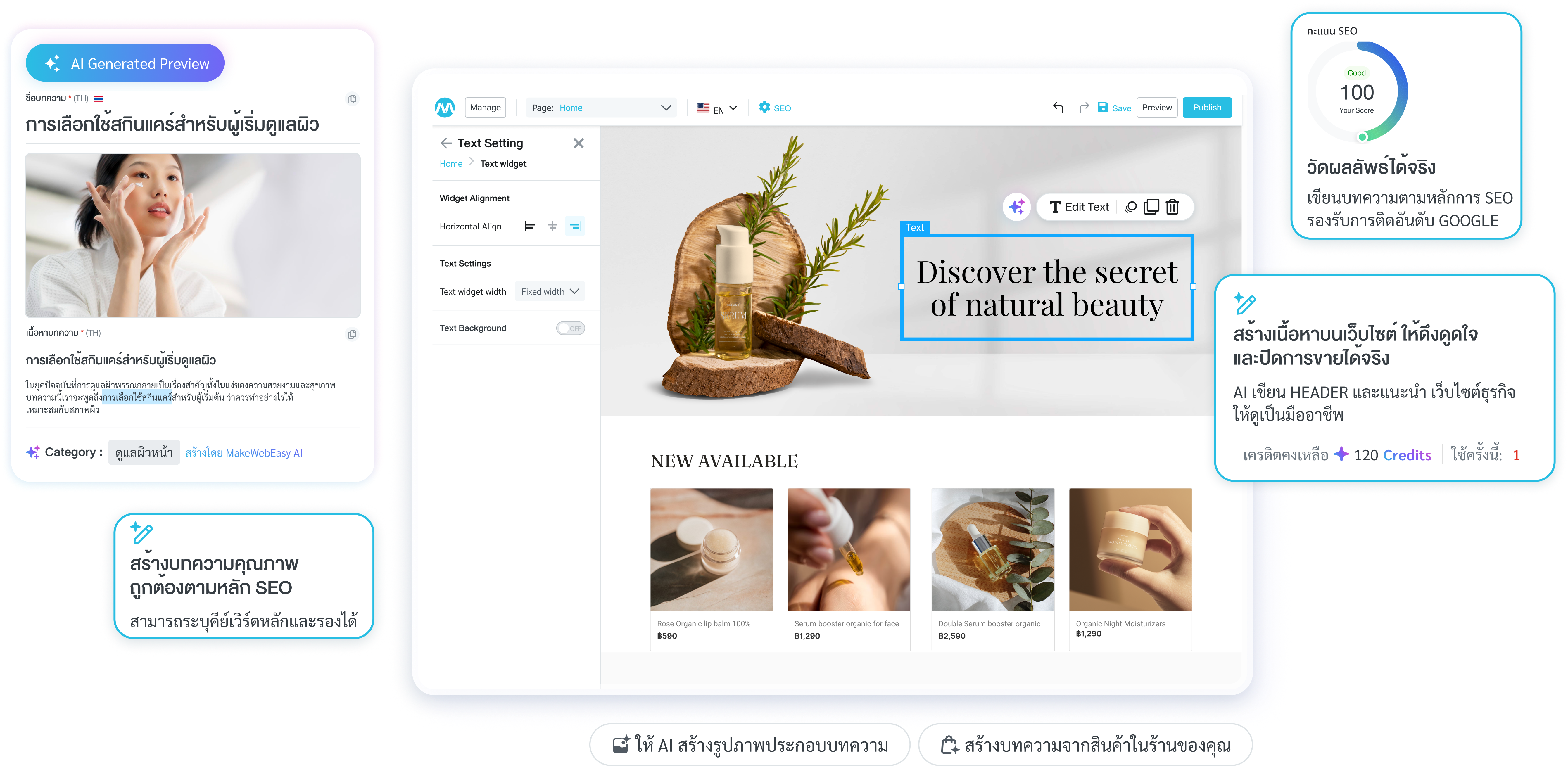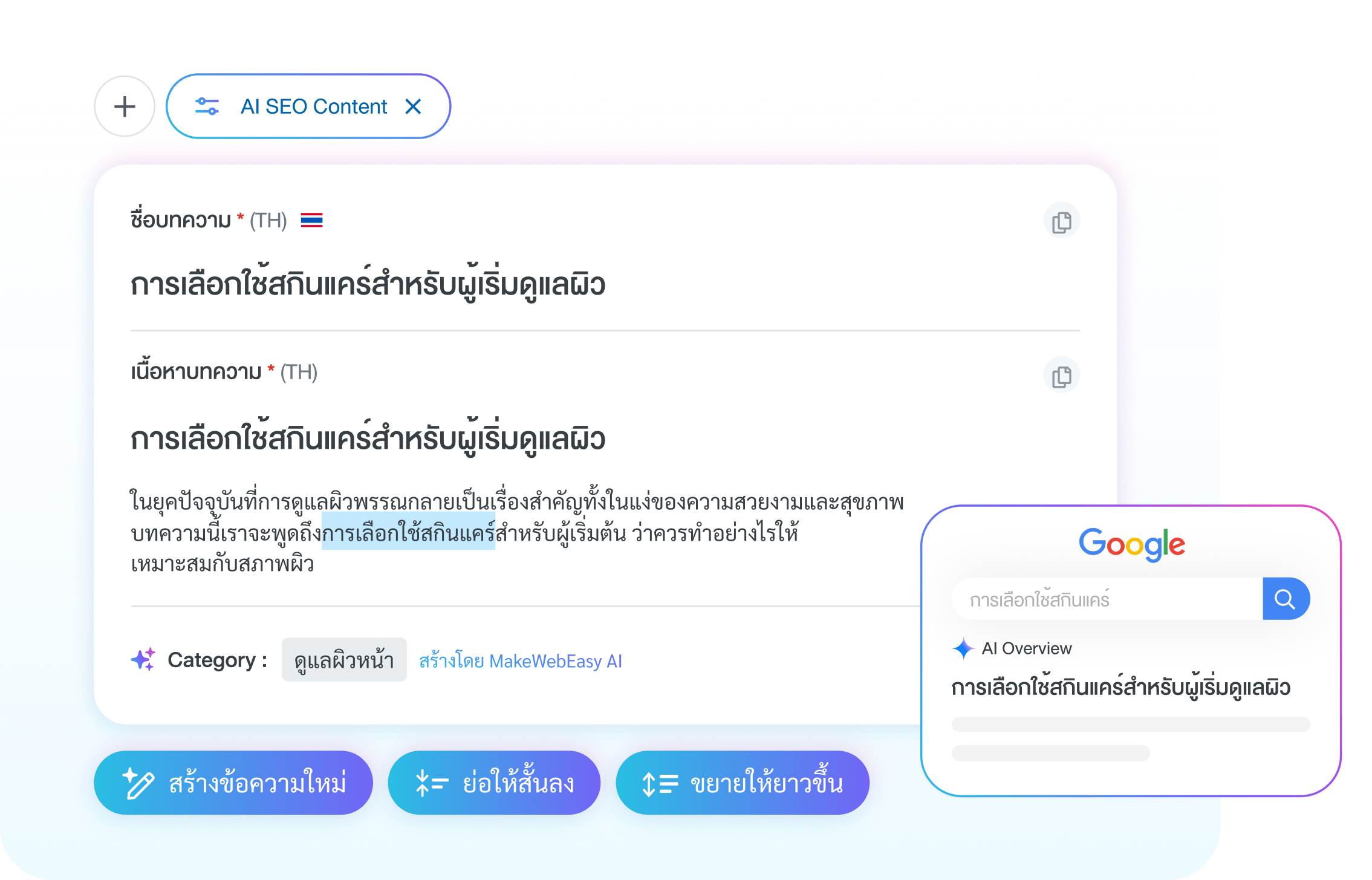 MakeWebEasy AI ถูกออกแบบมาเพื่อสร้างคอนเทนต์ให้รองรับ SEO โดยเฉพาะ
