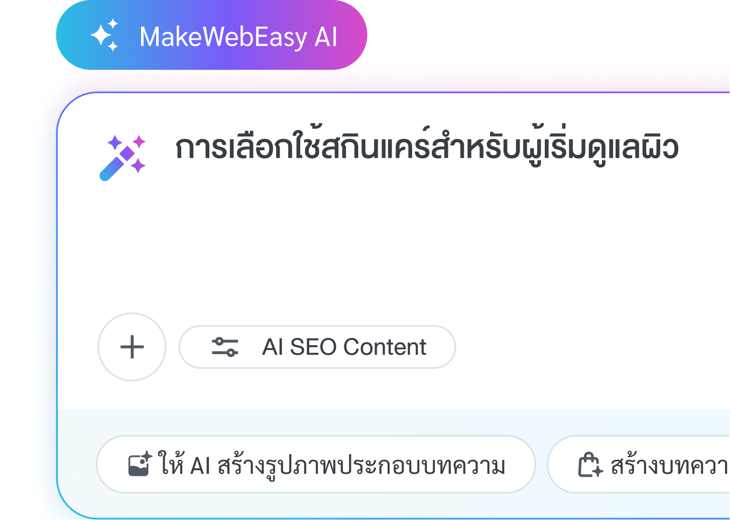 MakeWebEasy AI Content ช่วยสร้างคอนเทนต์ บนเว็บไซต์ครบวงจร ทั้งเขียนบทความ SEO, สร้างรูปภาพประกอบ, เขียนคำบรรยายสินค้า และปรับแต่งเนื้อหาให้เข้ากับแบรนด์ได้ในไม่กี่วินาที